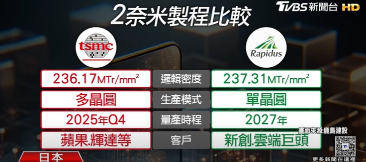據有關消息顯示,博通(Broadcom)可能給RAPIDUS流片成功,將會給RAPIDUS第一筆2奈米訂單,不曉得最近博通的股價大漲有關。根據網傳資料RAPIDUS的技術與台積電在2奈米上面已能互別苗頭,如圖所示。如果博通將2奈米晶片訂單多分給RAPIDUS那就表示台積電就會空出一些產能分給別家。